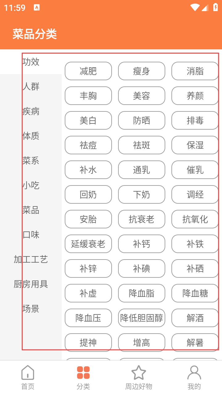 2、在分类页,选择如【排毒】等功效标签,筛选对应菜品。