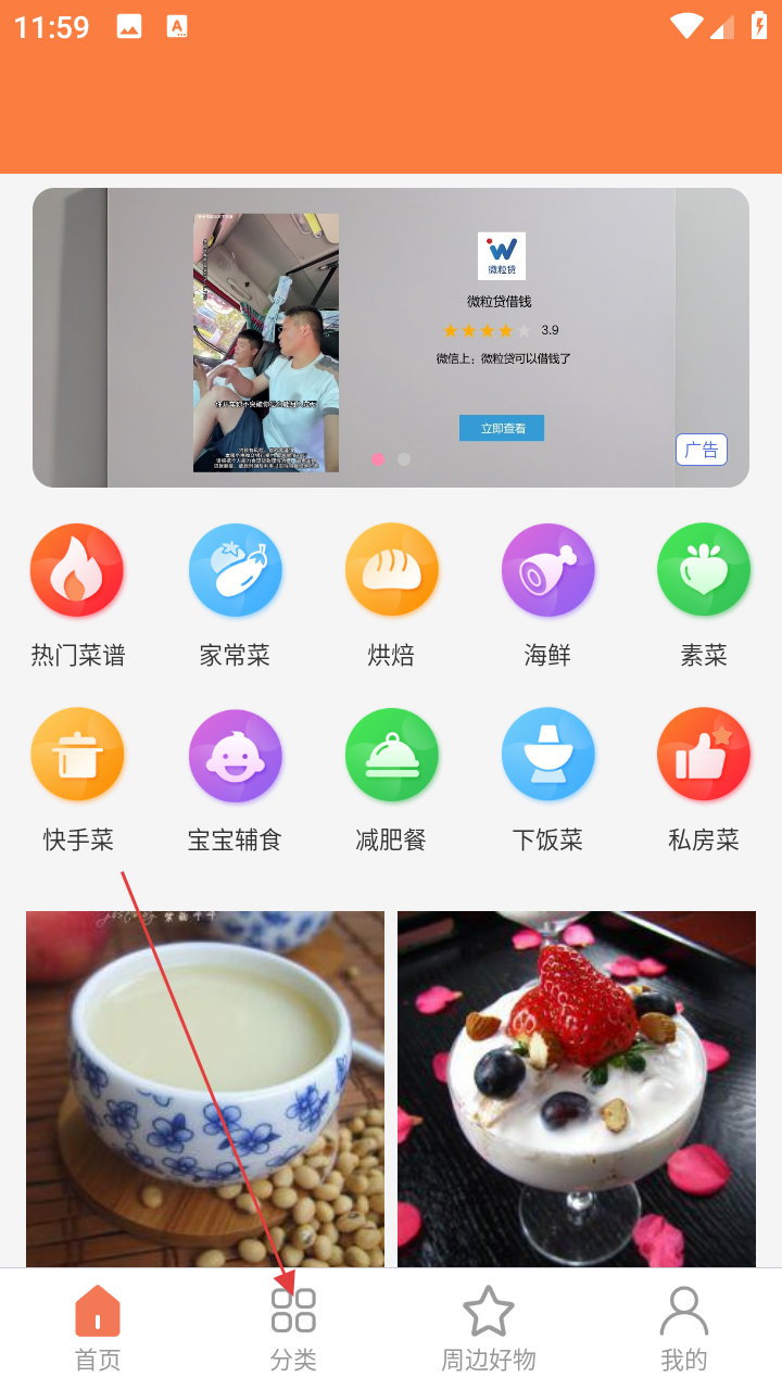 1、打开应用,点击底部【分类】,进入菜品分类页面。