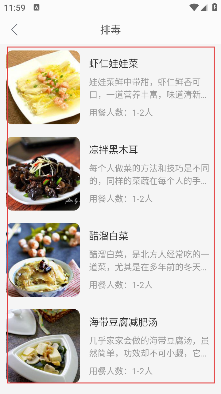 3、浏览“排毒”分类下的菜谱,如【虾仁娃娃菜】【凉拌黑木耳】等,选感兴趣的。