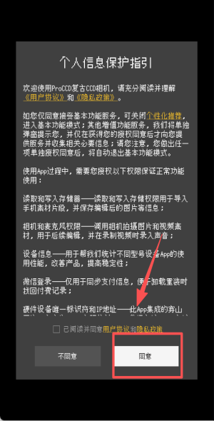 1、阅读个人信息保护指引后点击“同意”,依次授权存储、相机、麦克风权限。