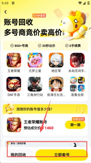 4、去“账号回收”测身价,30秒出价立刻卖号。