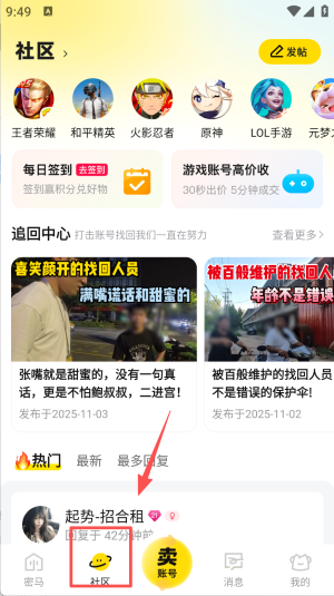 2、进入社区签到领积分,再浏览高价回收帖。