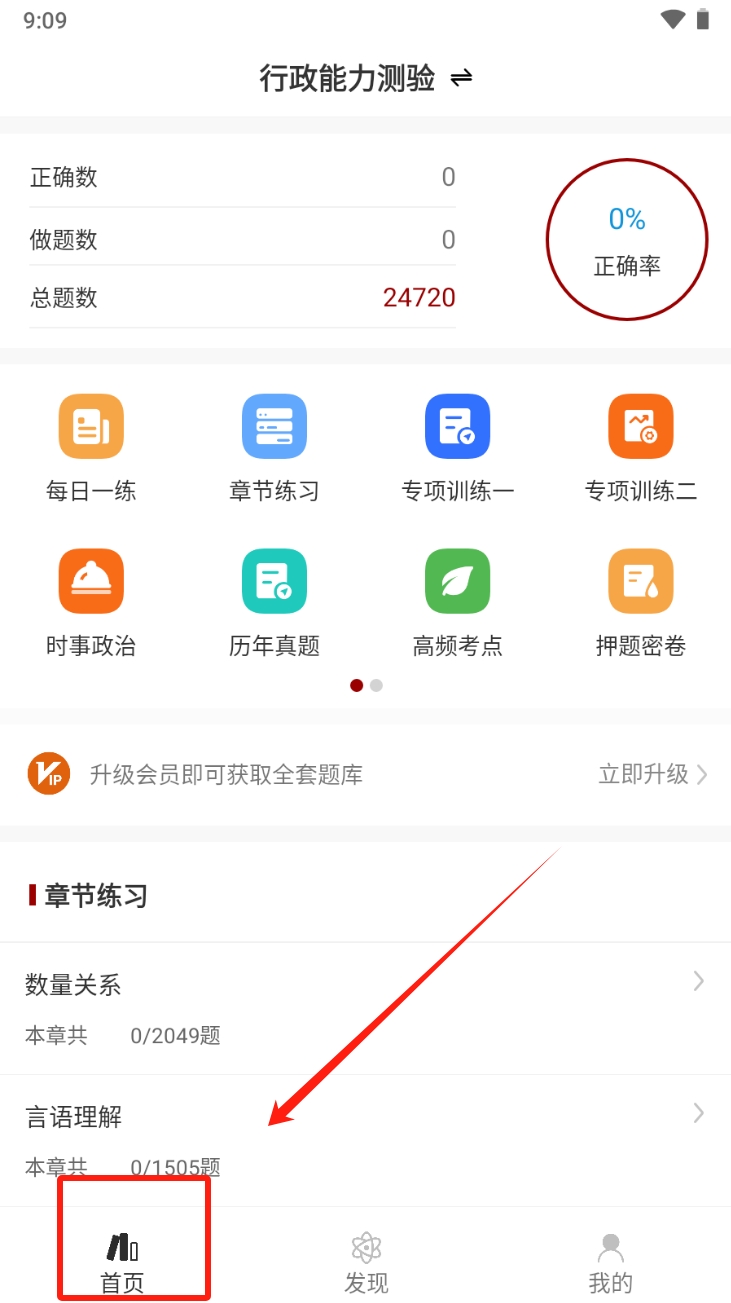 1、点击“首页”按钮以选择需要的答题练习模式,可选择性挑调整题目。