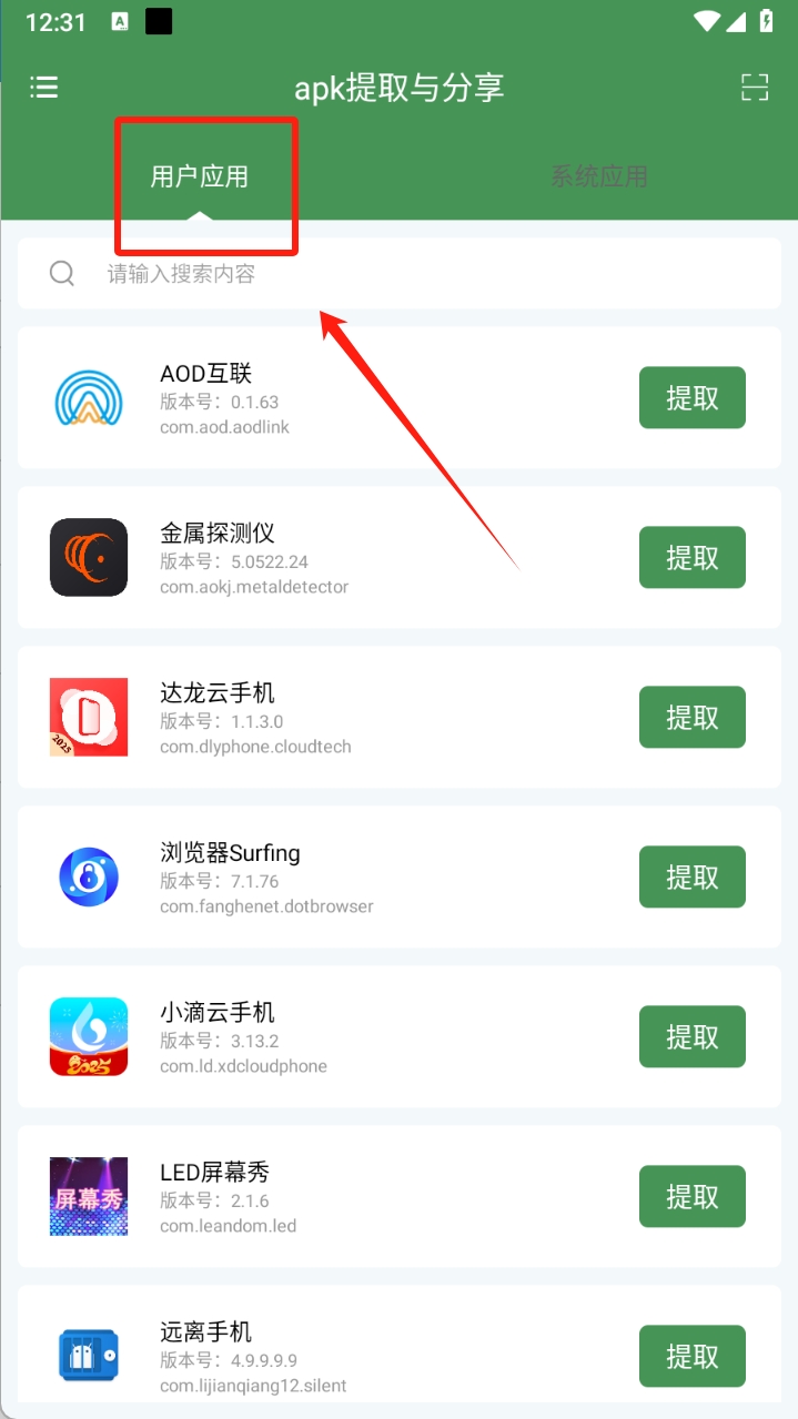 1、在apk提取与分享软件中,点击“用户应用”标签,查看已安装的第三方应用列表。