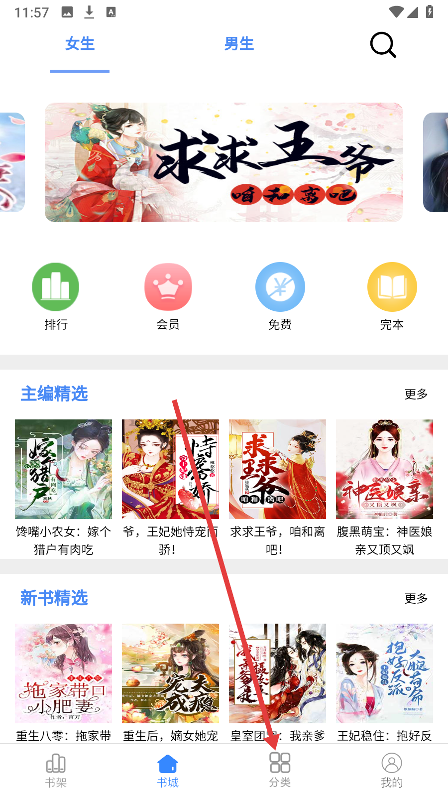 1、在书城页,点击底部【分类】进入小说分类界面。