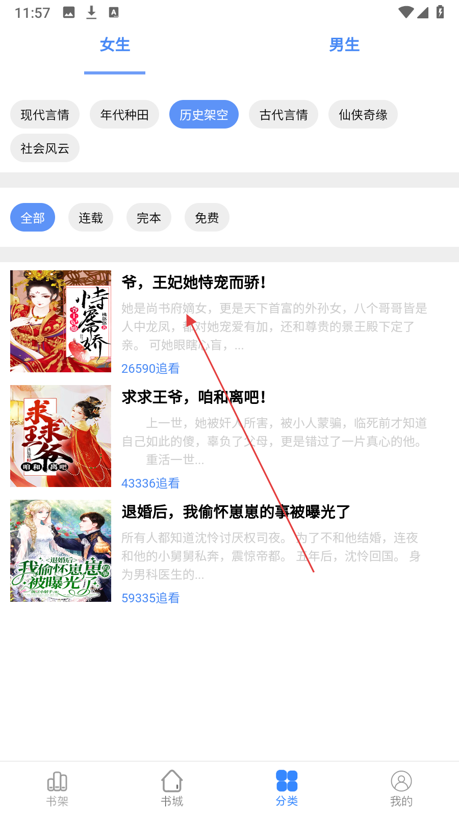 2、在分类页,选【感兴趣的分类】浏览对应小说列表。