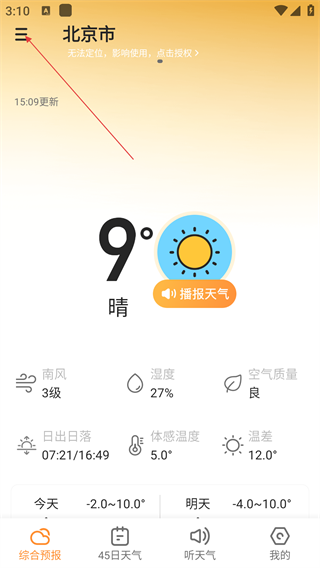 1、在北京市天气主界面,点击左上角菜单按钮,进入城市管理页面。