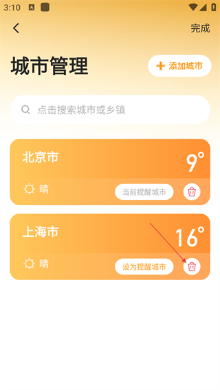 3、在编辑模式下,点击目标城市(以上海市为例)右侧的删除按钮,可移除该城市。
