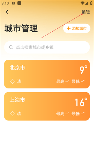 2、在城市管理页,点击右上角【编辑】按钮,进入城市编辑模式。