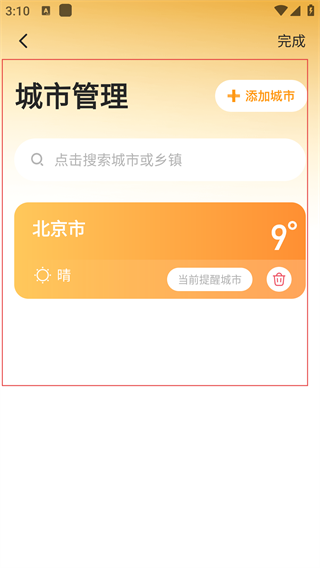 4、删除完成后,点击右上角【完成】按钮,退出编辑模式,城市管理列表将仅保留剩余城市(如北京市)。