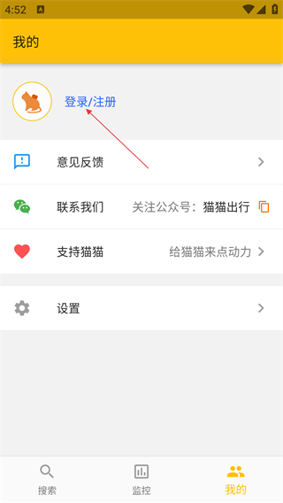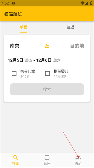 1、进入“猫猫航班”App的搜索页面,点击底部【我的】进入个人中心。