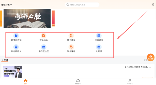 2、进入主界面后,根据个人需求选择感兴趣的课程,将提供相关学习资源,为你的考研提供支持。