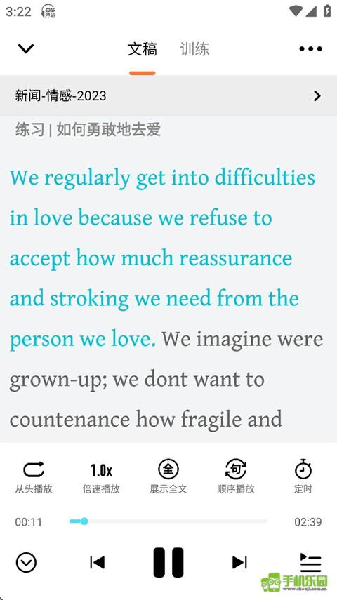 2、进入播放页面后,下方配备了从头播放、倍速播放、全文/单词展示、顺序播放以及定时等功能。