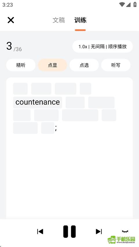 3、听完过后还可以进行训练,精听、点显、点选、听写等模式;