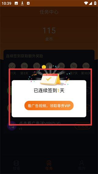 4、签到完成后,会提示已连续签到天数,还可选择看广告视频领取尊贵VIP哦。