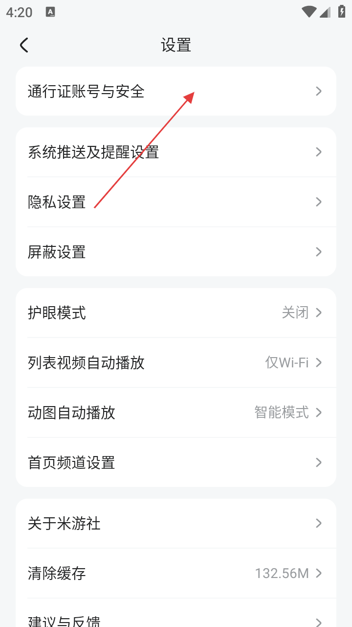 3、在设置页面,点击【通行证账号与安全】选项,可进入账号与安全界面,界面显示手机号、邮箱等功能。