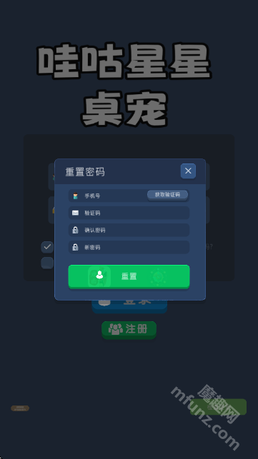 4、 忘记密码时,进入重置密码界面,输入手机号,获取验证码,设置新密码,点击“重置”修改密码。