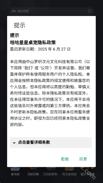 1、打开哇咕星星桌宠并阅读隐私政策后,点击“同意”按钮以接受相关服务