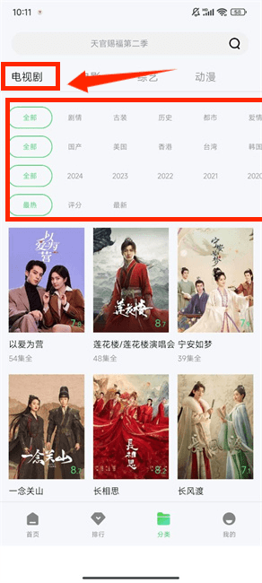 2、进入分类页选择电视剧,能按剧情类型、地区年份及热度进行多重筛选。