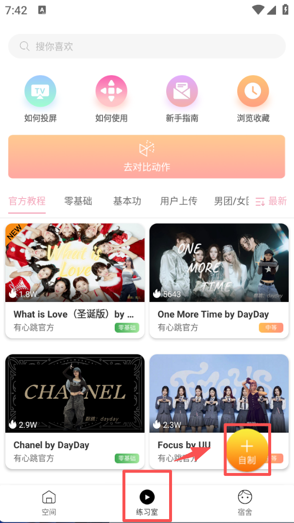 3、切换到 “练习室” 栏,页面右侧有 “自制” 按钮,点击后可进入相关创作界面,同时能查看官方教程等内容。