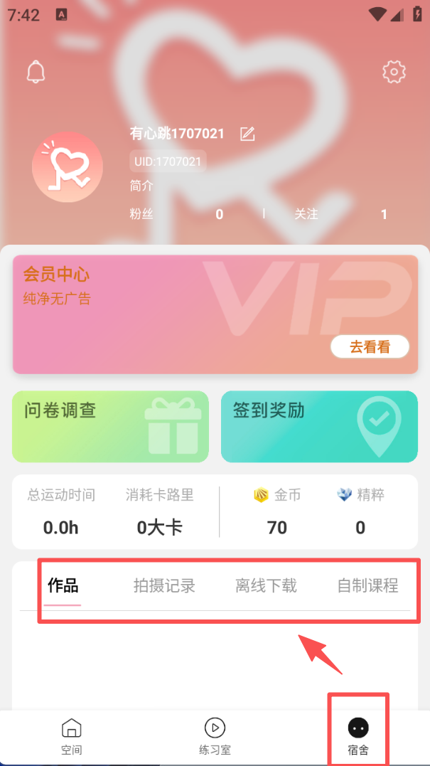 4、点击底部 “宿舍” 栏,进入个人页面后,可看到 “作品”“拍摄记录” 等标签,点击对应标签查看相关内容。