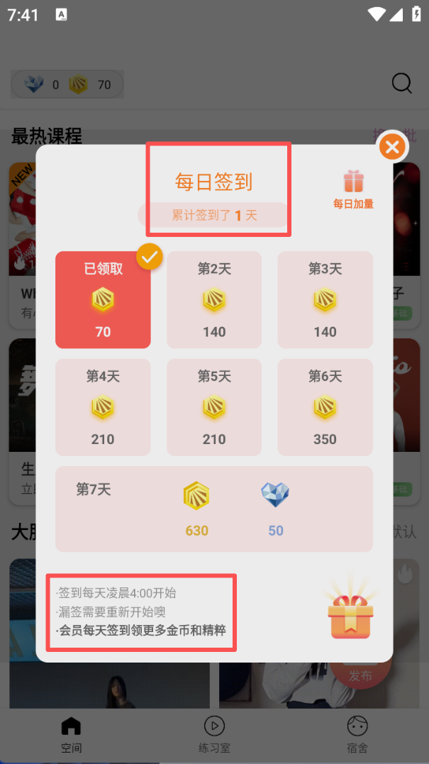1、进入 “空间” 栏,页面会弹出 “每日签到” 窗口,可领取对应天数的金币,漏签需重新累计,会员能获更多奖励。