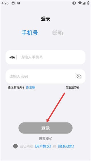 1、在登录页面,可选择在【手机号】输入框填写号码,然后在【密码】输入框填写密码,勾选【我已同意《用户协议》和《隐私政策》】后点击登录按钮。