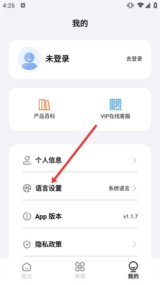 3、进入【我的】页面后,找到【语言设置】选项,其当前显示为【系统语言】,点击该选项即可进入语言选择界面。
