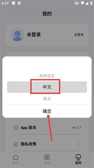 4、在语言选择弹窗中,选择【中文】选项后,点击【确定】按钮,即可完成软件语言的设置操作。