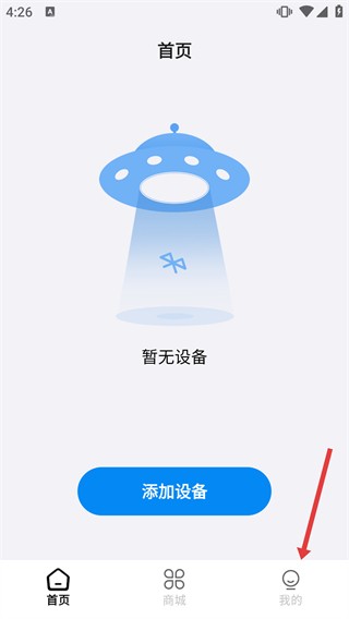 2、进入首页后,若看到【暂无设备】的提示,可点击【添加设备】按钮来关联设备;之后点击底部的【我的】,即可进入个人中心页面。