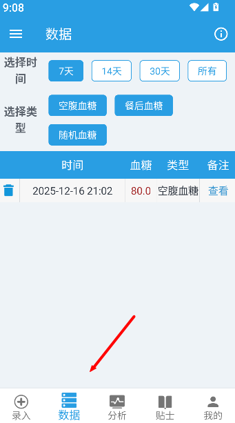 2、保存完成后进入数据列表页面,可按日期查看已记录的血糖信息,内容展示清楚直观。