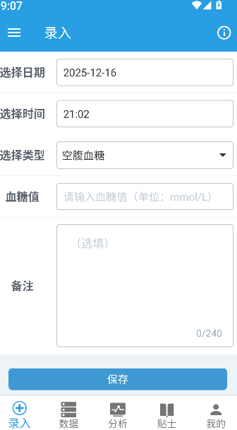 1、打开《我的血糖记录》,进入记录页面,填写测量时间与血糖数值,确认信息无误后点击保存完成录入。