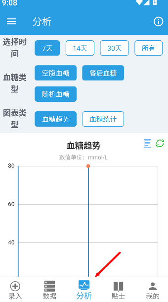 3、进入分析页面,查看血糖变化情况,对比不同时间的数据,了解整体变化趋势。