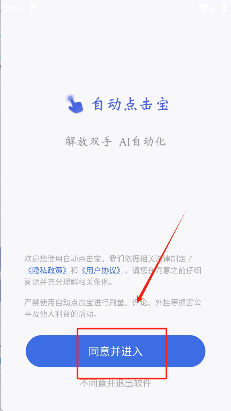1、在自动点击宝应用介绍页面,点击“同意并进入”按钮以接受协议。