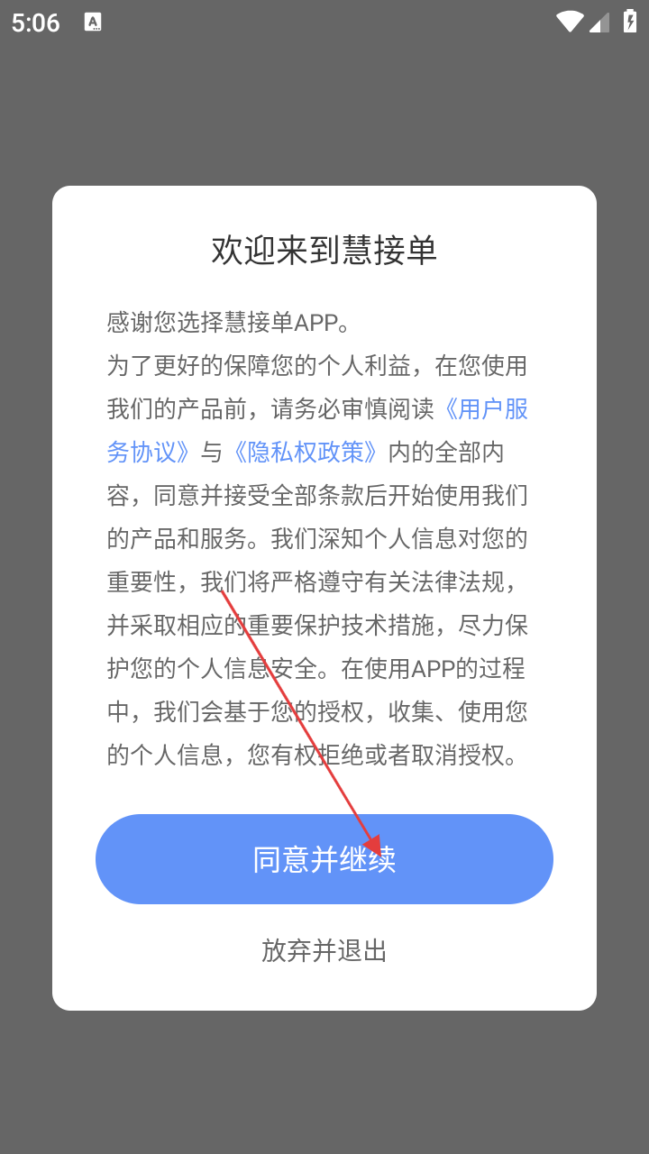 1、进入慧接单,阅读协议后点【同意并继续】,开启使用流程。