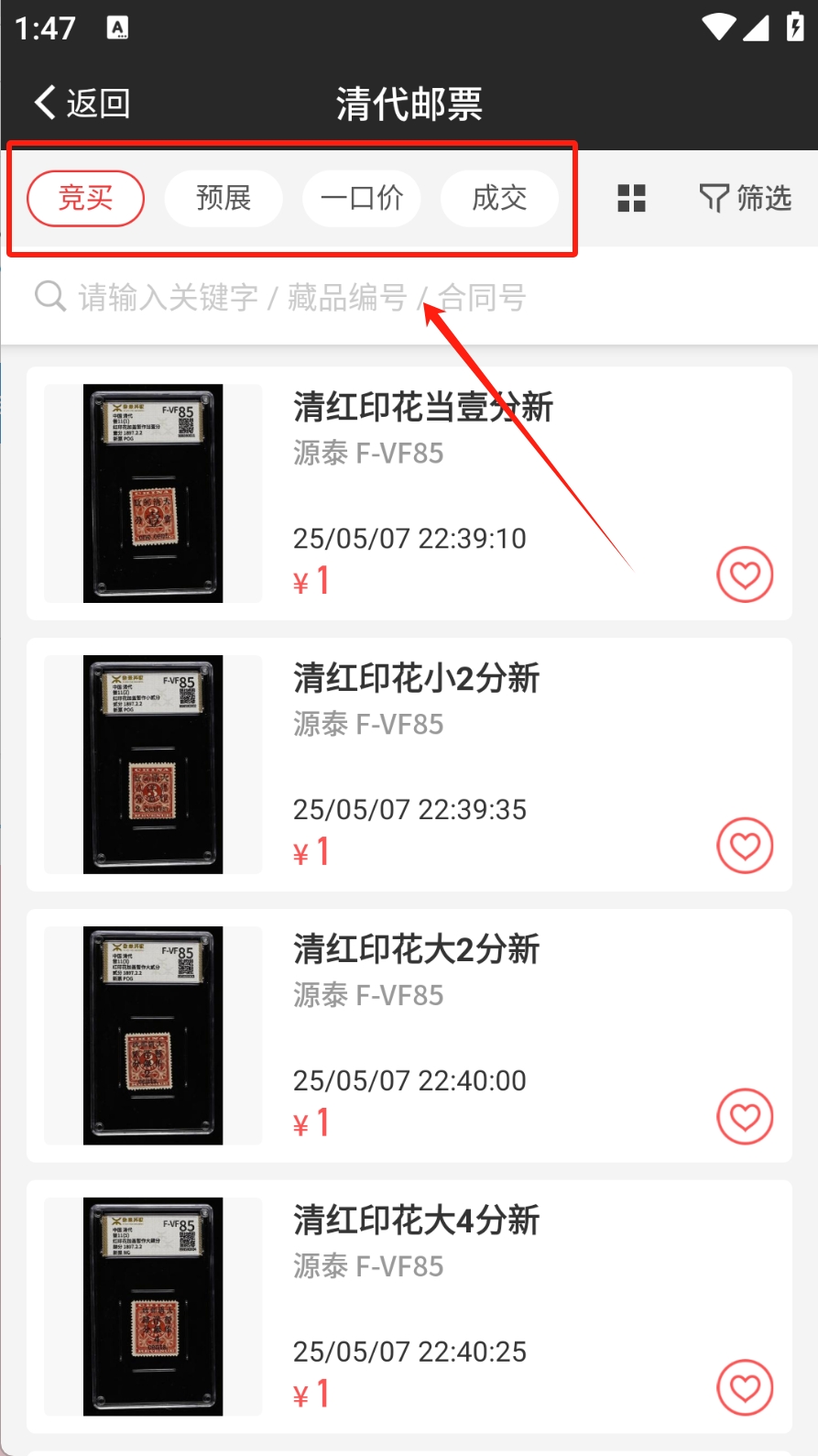3、参与竞买:点击“竞买”查看并参与邮票的竞拍活动。