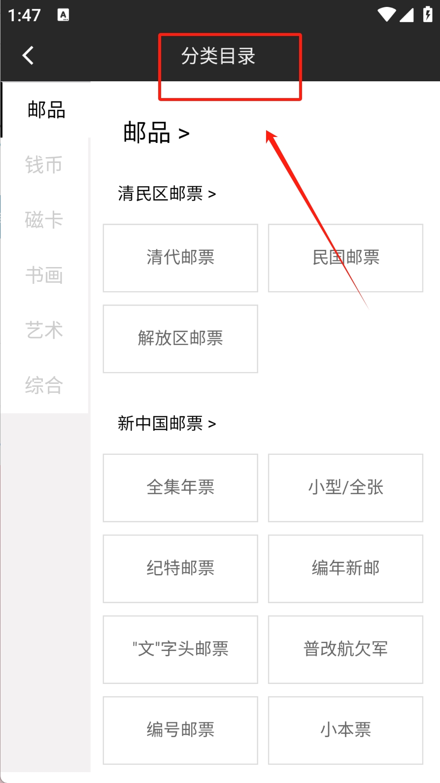 2、选择邮票类别:在分类目录中选择“民国邮票”等具体类别。