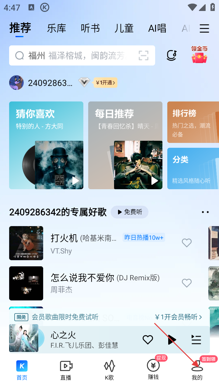 1、在酷狗音乐首页,点击底部的【我的】选项,进入个人中心页面。