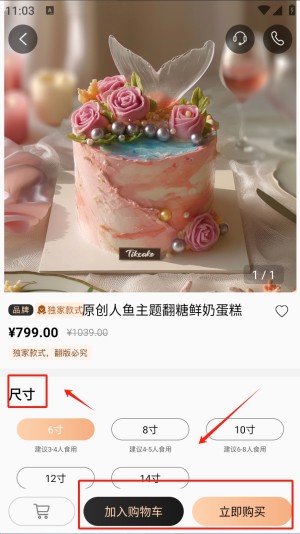 4 、定制蛋糕尺寸:在选定蛋糕的详情页,选择所需的蛋糕尺寸,并点击加入购物车。