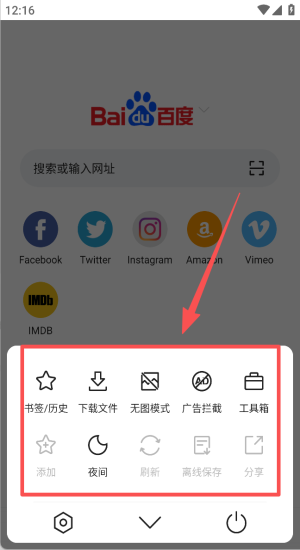 3、打开工具箱启用广告拦截与夜间模式,离线保存页面省流量。