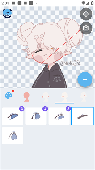 3、进入捏人编辑界面后,可选择不同部件(如眼型)调整形象,点击右上角相机图标可保存作品。