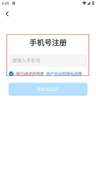 3、进入注册界面输入手机号点击获取验证码即可完成注册。