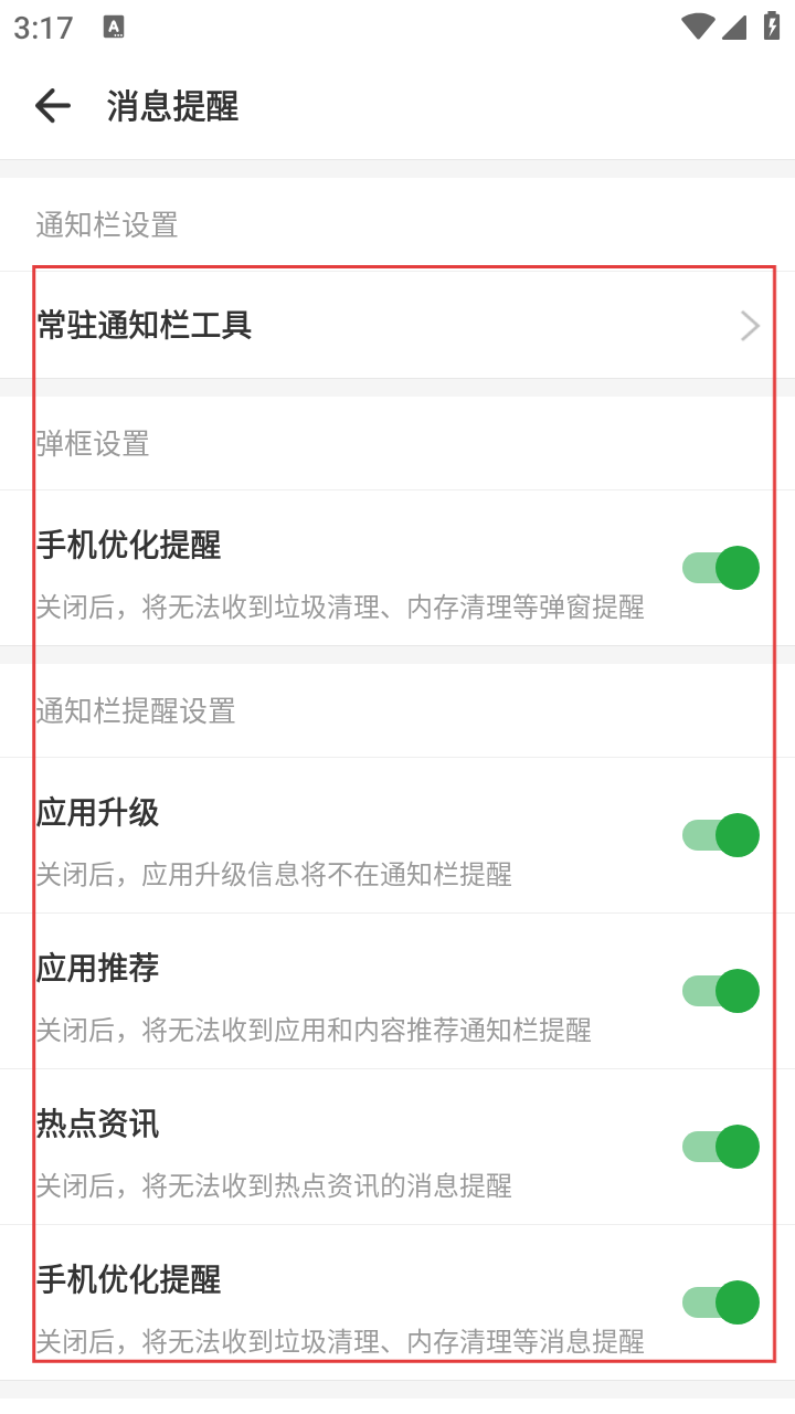 4、在消息提醒设置界面,可对【手机优化提醒】【应用升级】等多项通知权限进行开关设置,按需调整以管理消息提醒。