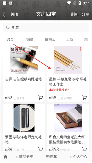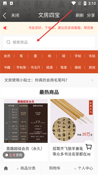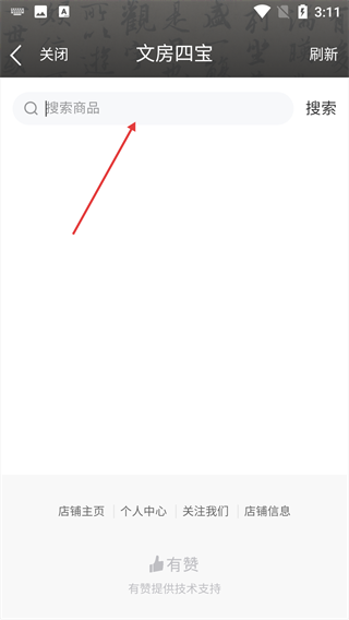 2、进入文房四宝页面后,点击顶部的【搜索商品】输入框。