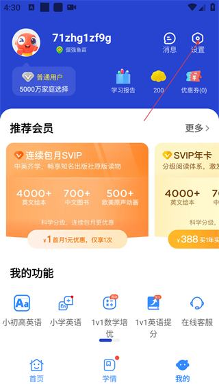 2、在个人界面的推荐会员区域,可查看【连续包月SVIP】权益,首月享1元优惠,涵盖多类学习资源,点击右上角的设置图标。