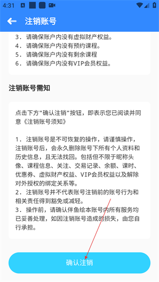 4、进入注销账号页面后,需阅读并同意《注销账号须知》,确认账号信息已妥善处理后,点击【确认注销】完成操作。