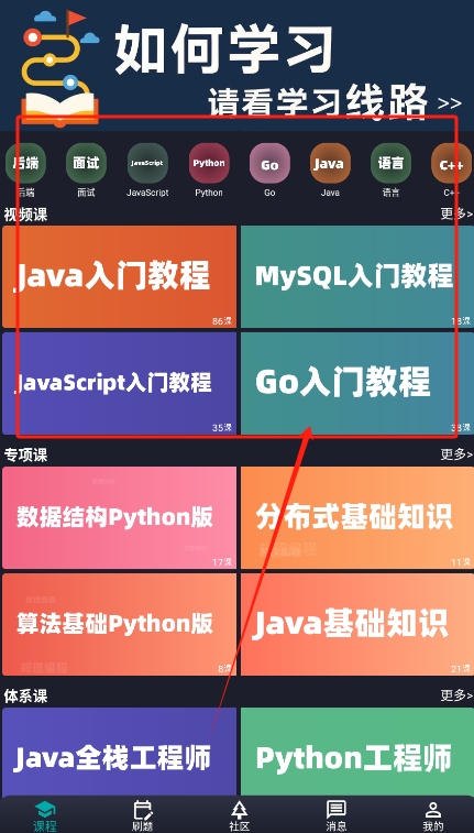 1、丰富的课程体系,各个编程语言与技术,为用户提供多样选择,帮助他们找到最适合自己的学习路径。