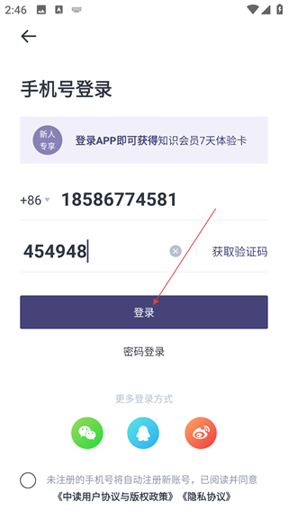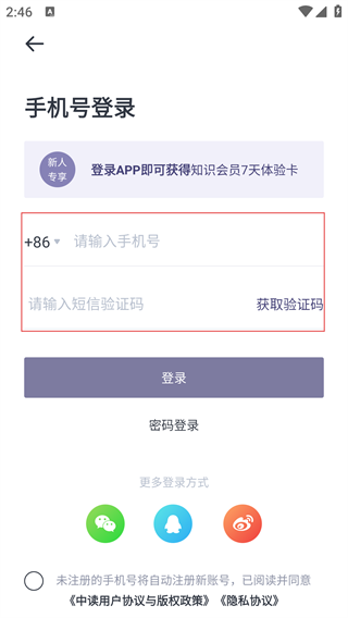 3、在手机号登录界面,需输入手机号和短信验证码,新人登录可获知识会员7天体验卡,也可选择密码登录或第三方账号登录。