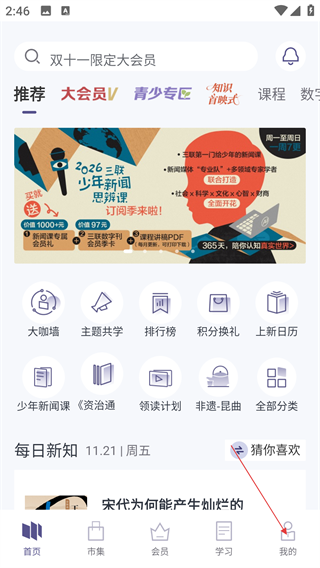 1、在知识类APP首页,有推荐、大会员等板块,还有大咖墙、主题共学等功能入口,点击【我的】可进入个人界面。