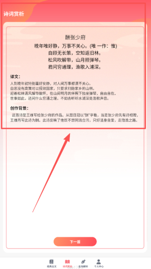 3、访问诗词赏析版块,浏览不同朝代的诗词作品,深入理解每首诗的情感及历史背景。